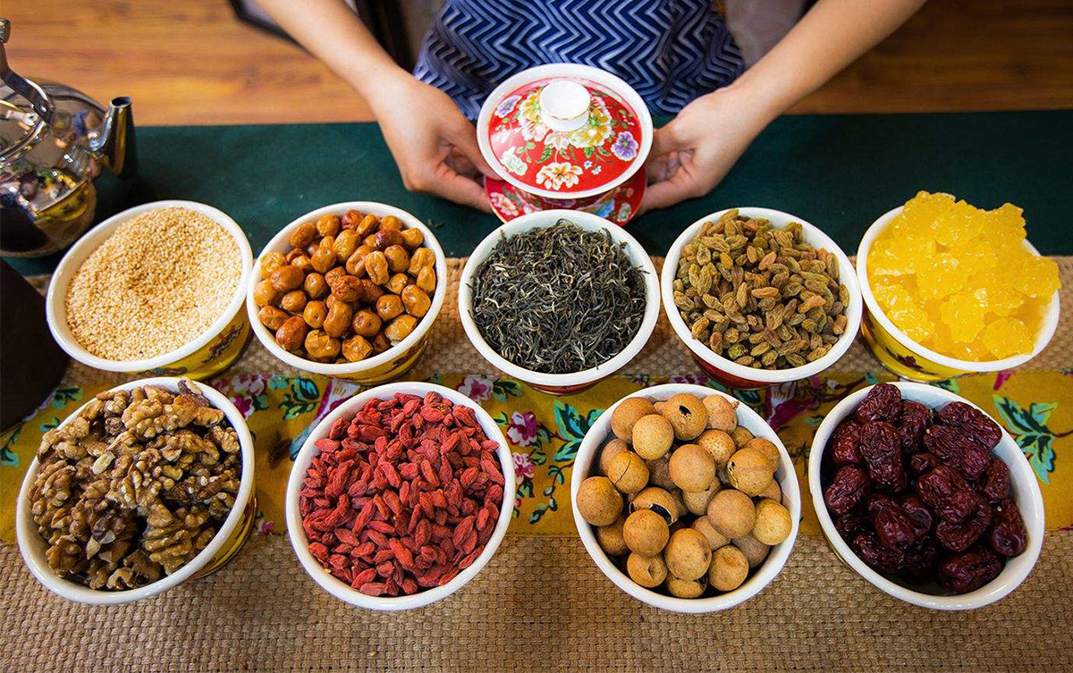 此時(shí)正值嚴(yán)冬時(shí)節(jié),食補(bǔ)最重要的功效就是能夠暖身祛寒。除了臘八粥,暖心養(yǎng)生的“八寶茶”也能做到。八寶茶以茶葉為底,摻有白糖或冰糖,由八種茶料搭配而成。一般選擇茶葉、桂圓、核桃、芝麻、枸杞、葡萄干、紅棗、菊花等食材,材料并不是固定的,大家可以根據(jù)體質(zhì)或個(gè)人喜好的口感來選擇茶料搭配。八寶茶口感清甜,滋味獨(dú)具,有滋陰潤肺、清嗓利喉的功效,西北地區(qū)氣候干旱,因此深受當(dāng)?shù)厝说南矏邸?/span>